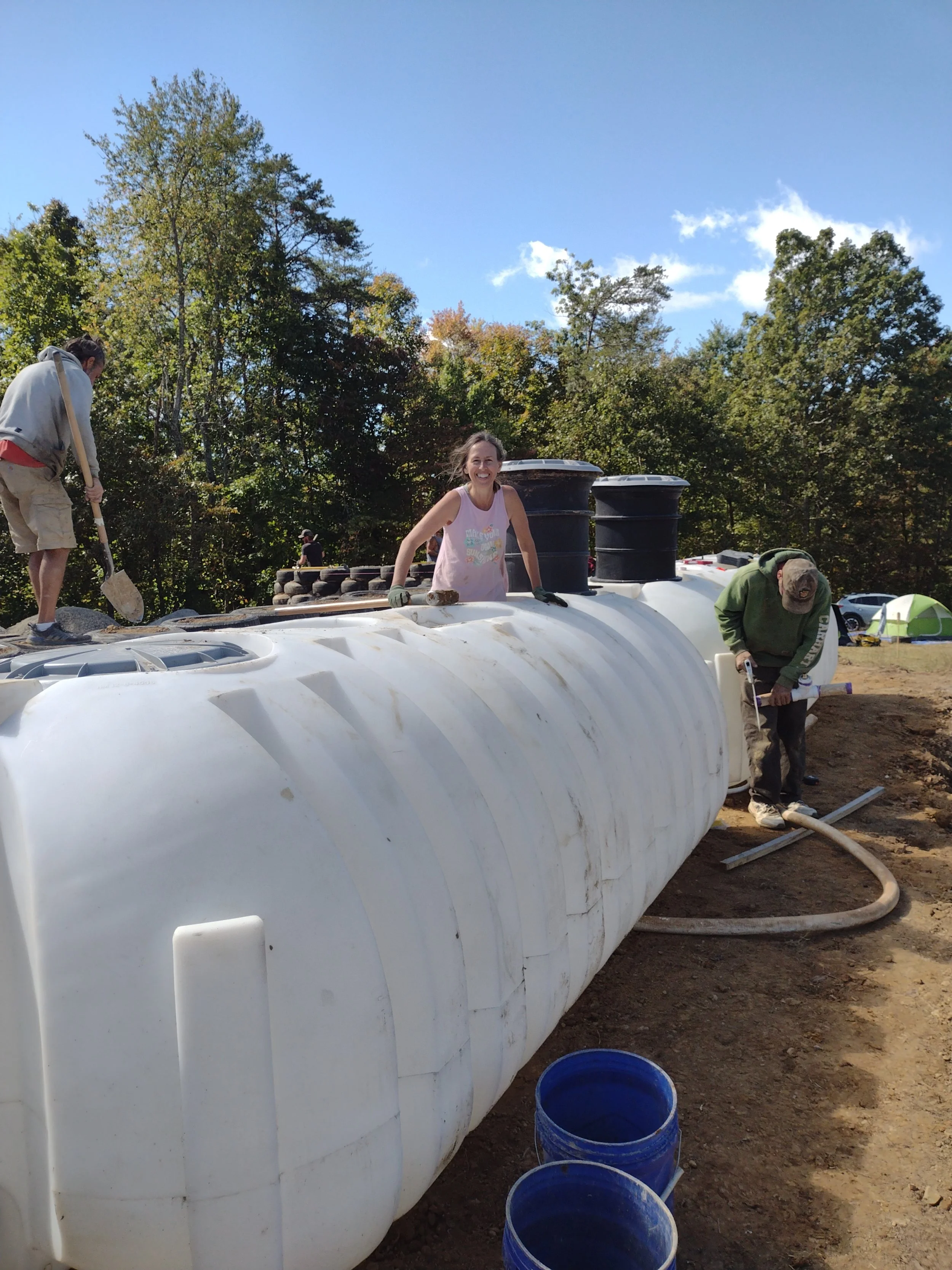 it was a much smaller group of people working today. saturday is optional for the students, but it’s a half day for the crew. there were two major things happening - placing and connecting the cisterns, and adjusting and leveling the top course of tires.