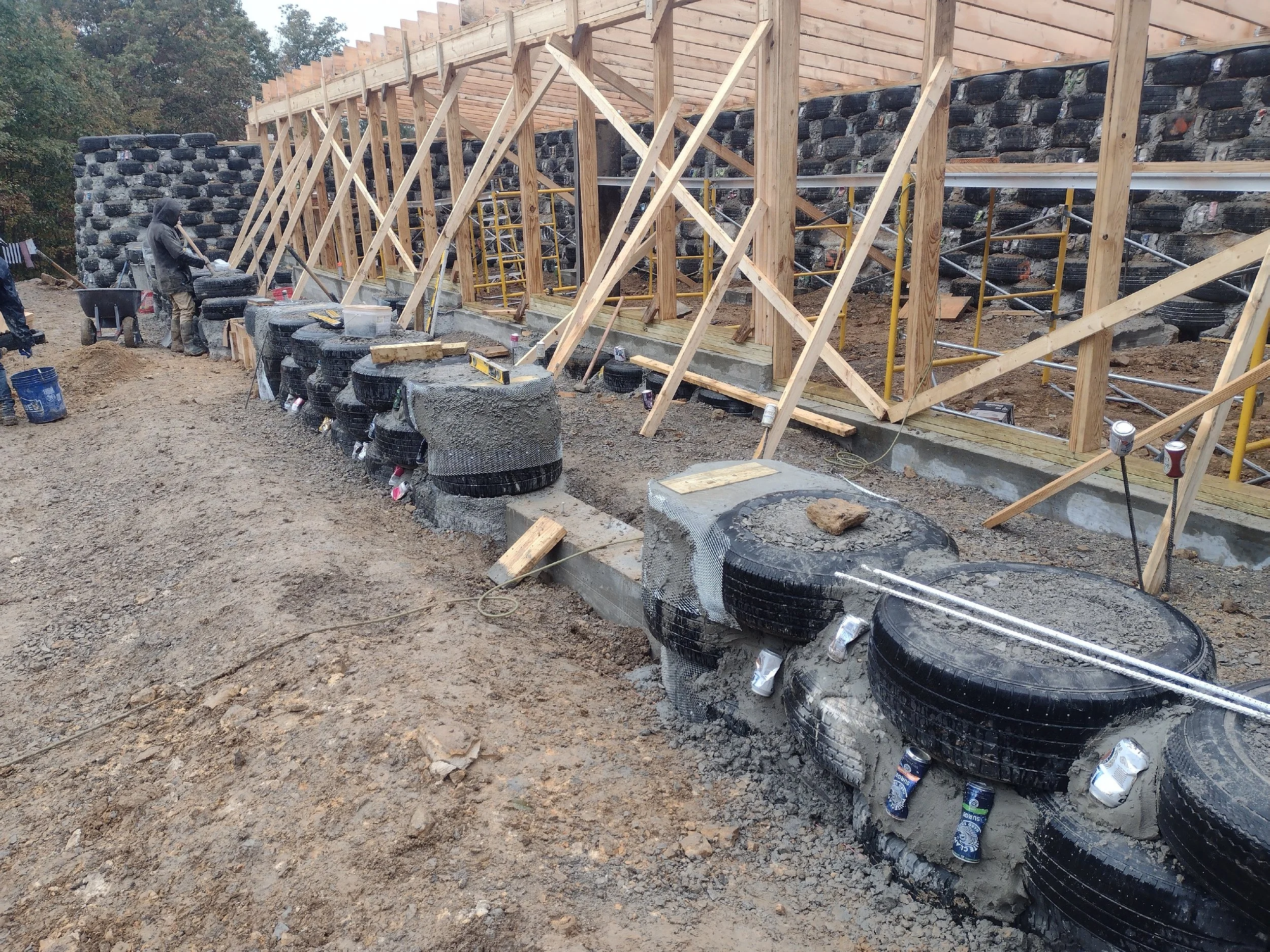 here’s a look at the outer greenhouse wall progression. the spaces between the tires will be exterior doors, with windows sitting atop where the tires are now. that concrete pour is floor level.