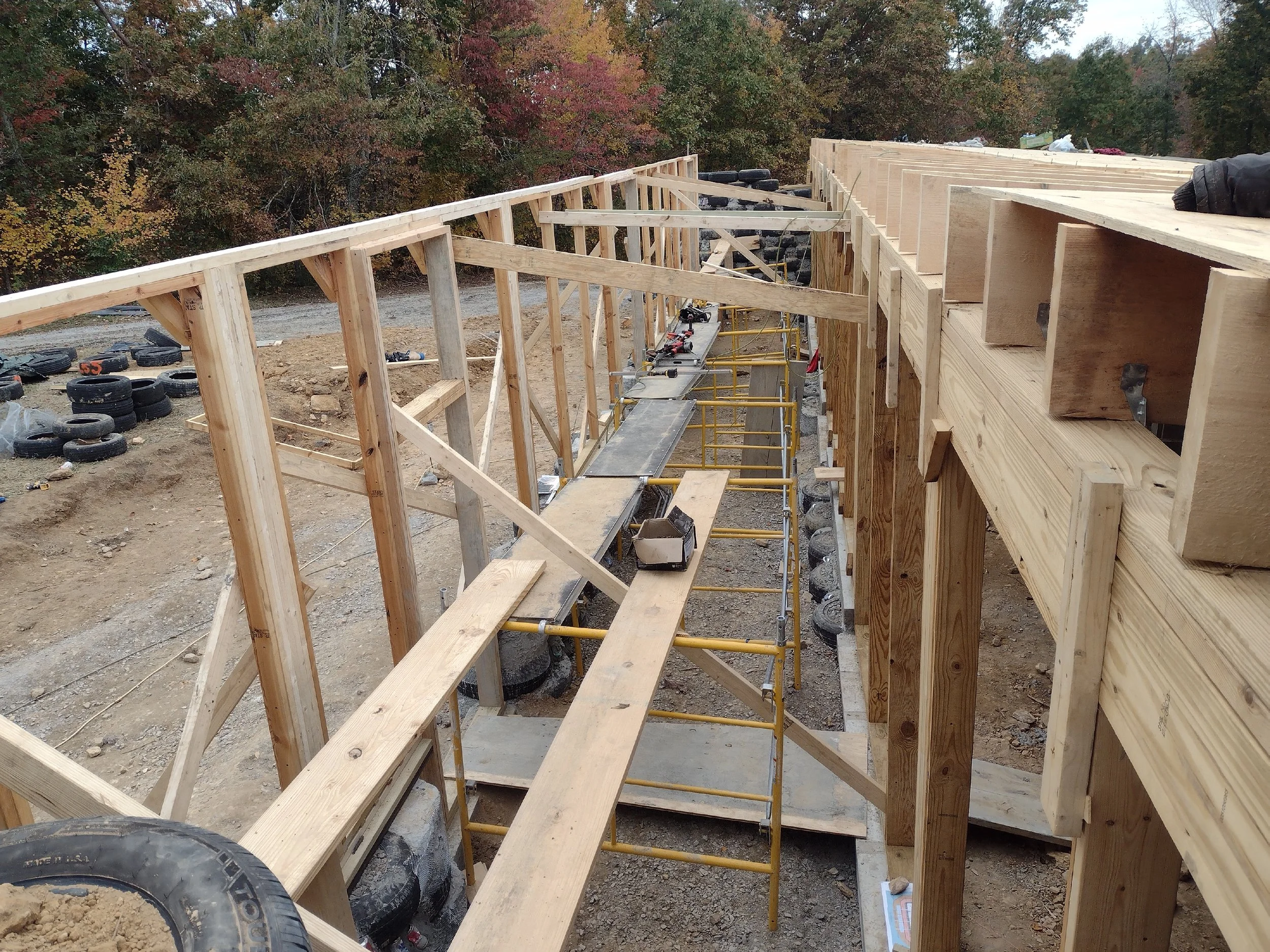 for example, i worked with hans, dina, and nathaniel on bracing and plumbing the outer greenhouse wall. then the four of us were recruited by will to erect the scaffolding. i pounded tires with christin and rio. i made a beam that will fit between a door and a windowbox with john. i cut hard insulation with kris and christin. some brief rebar work with nathan and anthony. then rolling and securing tar paper over the plywood on the roof with will, jade and nathan. nathan of the boundless energy, who basically sprinted while also squatting as he stapled the tar paper to the plywood.