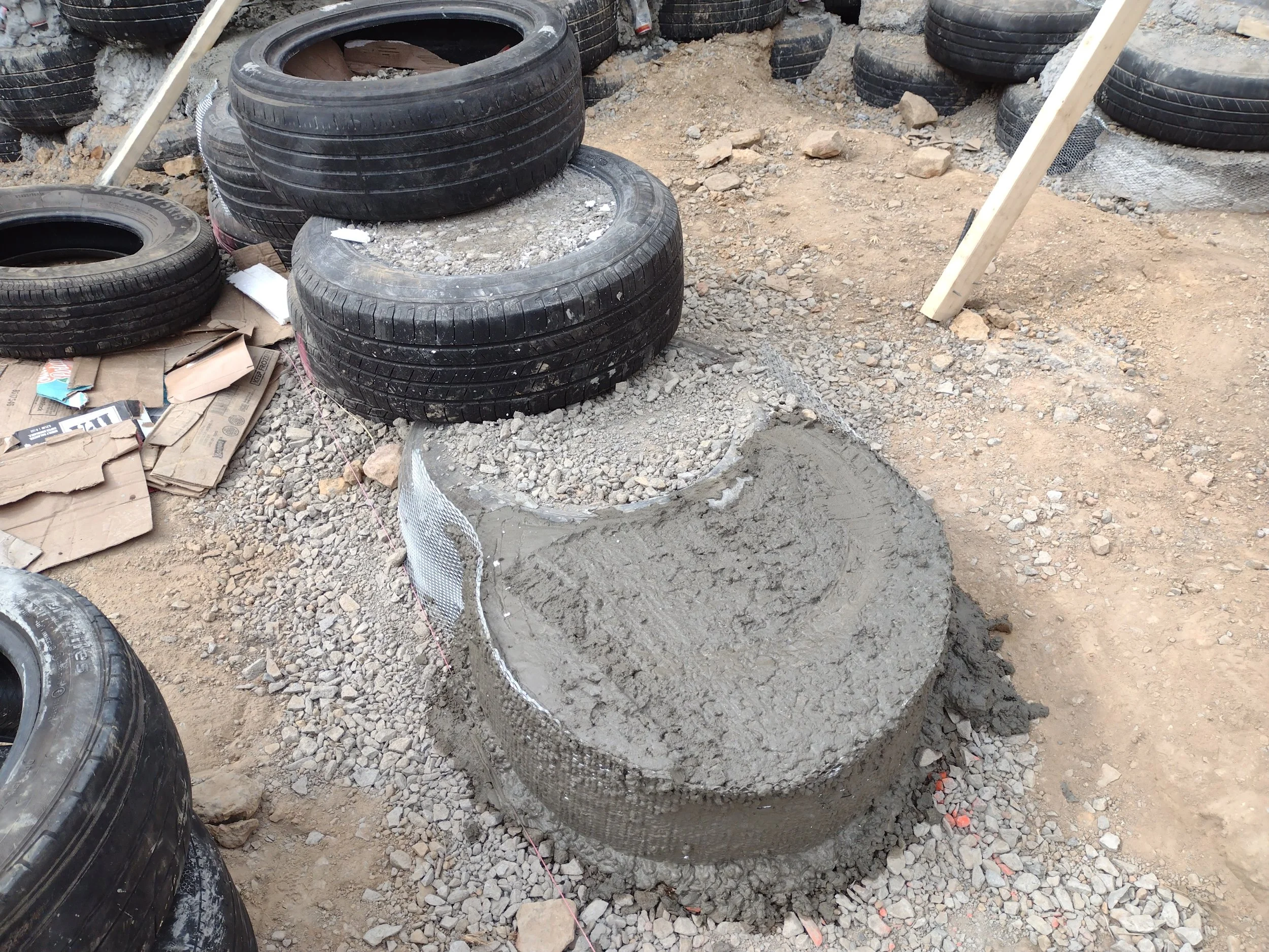 here’s today’s walk around. i’ve added a few pictures to show the can walls that are being placed between the top of the tire wall and the rafters. the can wall could be solid, without any cans, but that’s not structurally necessary. by using cans here, we make use of something that would be thrown away, and we save money on materials (the plaster).