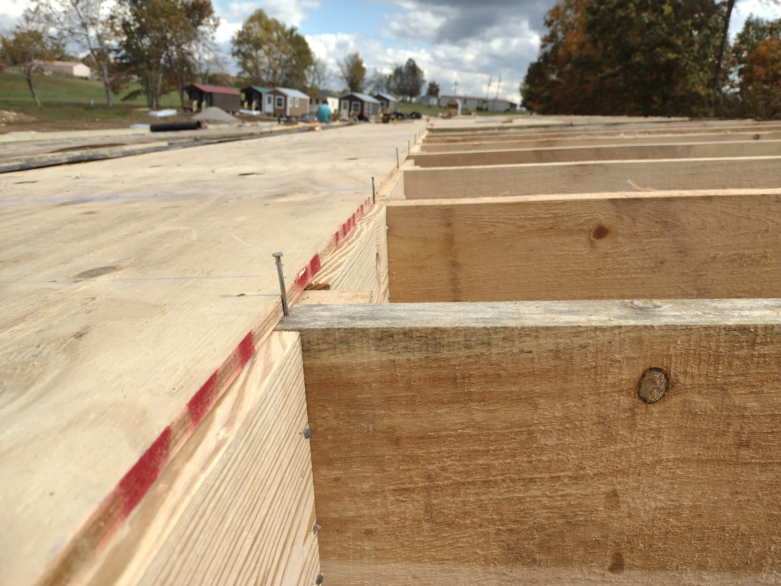 i was there for only half a day today, but pretty much everyone was involved one way or another with the roof. i started by helping slide the rafters into position. they’re 10-12 feet long (i think) and they weigh a ton (i know). it involved a bit of fancy footwork on the existing rafters and beam, sliding the pointy end out to where it was received by rory on the scaffolding, then using a pneumatic framing nailer to secure it. i liked that a lot. then a bunch of us put in the bracing between the rafters which not only support the rafters, but give the plywood on top a place to rest.